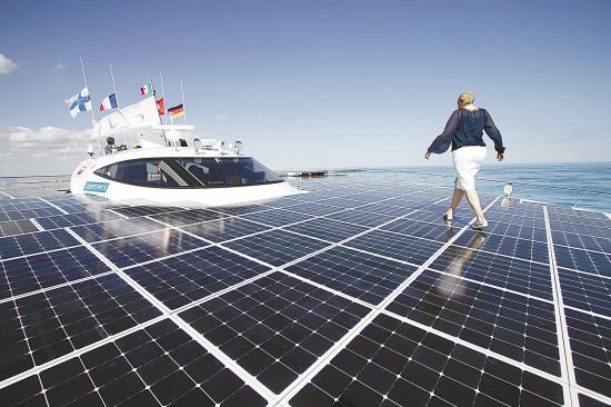 12月8日,在墨西哥坎昆,一名妇女行走在以太阳能为动力的“星球阳光”号双体船的甲板上。“星球阳光”长31米、宽15米,被制造商称为世界上最大的太阳能动力船。 新华社发