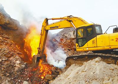 工作人员在黄天棉图矿区进行岩土剥离作业时,火焰腾空而起。