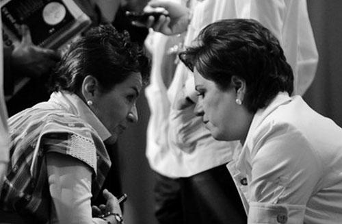 12月10日,坎昆会议主席、墨西哥外交部长埃斯皮诺萨(右)与《联合国气候变化框架公约》秘书处执行秘书交谈