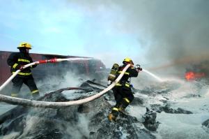 昨日,消防人员在灭火。当日13时许,浙江嘉兴南湖区余新镇华盛塑料厂发生大火。截至昨晚,厂区明火已扑灭。据救援人员透露,该企业在今年5月曾发生大火。新华社发