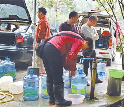 1月31日中午,在广州市帽峰山脚下的一个卖水点,一个上午卖掉了上千桶水。