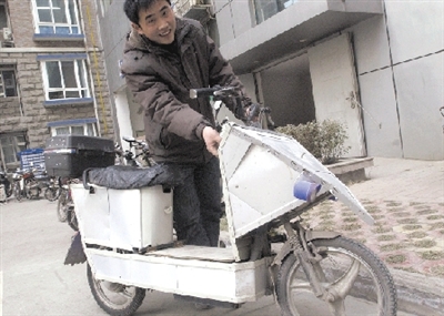 2007年买的电动车没跑多久,车身上就擦碰得不成样子。看着车上磕磕碰碰留下的痕迹,小郭就利用自己做装修的技术,把平时生意上用剩下的边角料按照车身的大小组装了一个外壳,然后又用家装厨卫等使用的铝扣板用铆钉固定上去。此外,还加装了照明灯和喇叭。电动车改装四五个月来,每每走在街上,都引来众人好奇的目光。