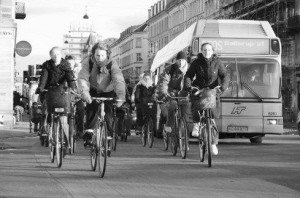 站在哥本哈根街头,放眼望去,男男女女,老老少少,戴着头盔,伏在车上疾驰而过,好像个个都是专业运动员似的,特别是在上下班高峰期,形成一道亮丽的流动景观。我所在的KU-LIFE校区,每天骑车上班上课的师生员工,估计能有一半以上。