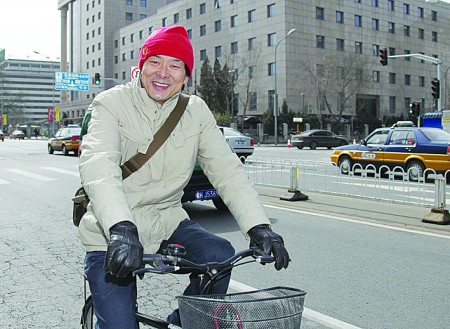 看记者正在拍照,让他配合一下,他咧嘴笑了,然后骑上车离开了。离开前,记者说,您出行很环保啊!他开玩笑说,就算低碳一次吧。(记者 郭静)