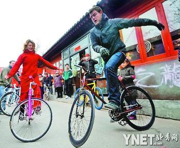 只能通过一辆小轿车的五道营胡同,几十名“老外”耍起车技,昨天(7日)下午,来自美国、德国、英国、法国等十六个国家的五十余名外国朋友用自行车表演,与“胡同邻居”共同倡导“绿色出行、低碳生活”主题。