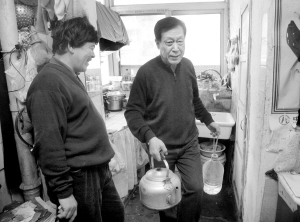 记者看到,居民常先生左手拎着塑料桶、右手提着铁皮壶,缓慢地沿外楼梯上楼。“顶楼都没水三个月了,我们过了个干巴巴的年。”他说,“自来水公司承诺年前来水,可没兑现,到现在还是这样。”