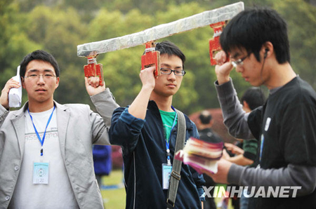 3月21日,3位大学生正在用行为艺术表现不同身份的人乘坐公交车,呼吁人们多使用公共交通工具。