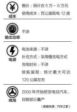 4月初,奇瑞汽车在其总部安徽芜湖举行了QQ3纯电动汽车用户交车仪式。奇瑞汽车总经理助理金弋波告诉《中国经济 周刊》:“QQ3纯电动轿车采用纯电驱动,百公里耗电仅12度左右。目前该车已经顺利通过国家安全碰撞测试,并已上榜工信部《节能与新能源汽车示范推广工程推荐车型目录》。”