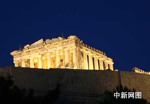 3月29日,北京奥运圣火传递到希腊首都雅典,圣火将在卫城著名的帕特农神庙前停留一晚。夜幕降临,帕特农神庙亮起灯迎接奥运圣火。 中新社记者 王欢