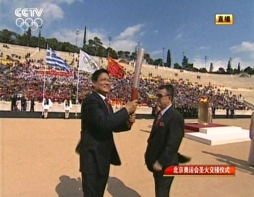 希腊奥委会主席基里亚库和北京奥组委主席刘淇前往讲台,基里亚库用希腊文致辞,刘淇则用中文致辞,欢迎希腊以及全世界的人们到北京观看奥运会。
