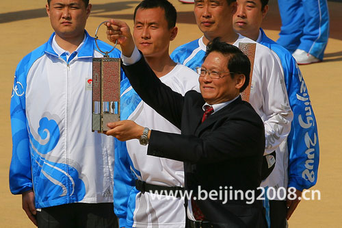 刘淇用圣火点燃火种灯并向世人展示 图据北京奥运会官方网站