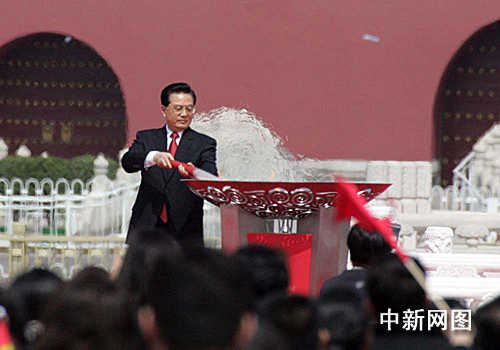 3月31日,北京奥运会圣火欢迎仪式暨传递启动仪式在北京天安门广场启动。图为胡锦涛主席在众人的注视下,用火炬点燃圣火盆。中新社发 张宇 摄