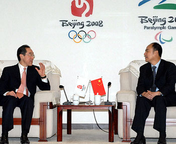 香港政务司司长唐英年在北京与第29届奥林匹克运动会组织委员会执行副主席兼秘书长王伟会面。(图片来源:香港特区政府网站)