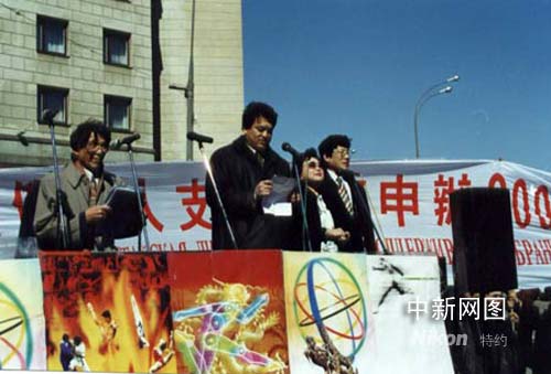 2001年,华人在莫斯科红场支持北京申奥大签名。(资料图片)