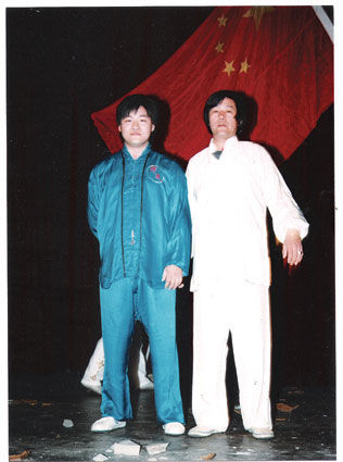 钱兰根(右)和儿子钱斌格每次演出都带着中国国旗(钱兰根供图)