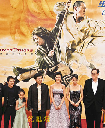 《功夫之王》北京首映礼,(左起)李连杰、李连杰女儿Jane、成龙、刘亦菲、李冰冰、导演洛文高夫等出席。(图片来源:文汇报)
