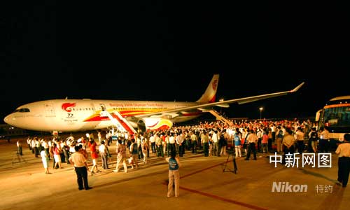 三日晚十时三十二分,搭载北京奥运圣火的“奥运圣火号”平稳地降落在海南三亚凤凰机场,北京奥运圣火抵达“和谐之旅”内地传递的第一站——海南三亚。徐勤涛 摄