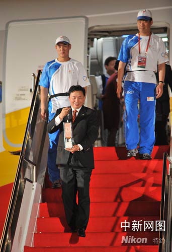 北京奥运圣火抵达三亚,北京奥组委执行副主席杨树安携带火种走下飞机