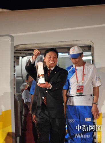 北京奥组委执行副主席杨树安举起圣火走下飞机