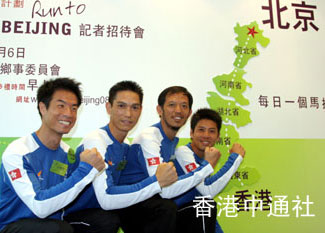 中新网5月6日电 据香港中通社报道,为了挑战自我极限,香港三位长跑精英和一位区议员,把握着中国首次举办奥运这个极具意义的机遇,决心以他们无比的意志,计划花2个月时间,从香港跑马拉松到北京,与祖国的同胞一同迎接奥运。