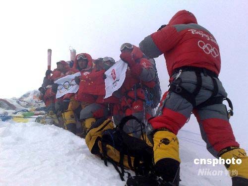 5月8日,北京奥运圣火珠峰传递登山队成功登顶珠穆朗玛峰。这是登山队员在峰顶展示“祥云”火炬、火种灯、中国国旗、奥运五环旗和北京奥运会会徽旗。中新社发 阿旺扎西 摄