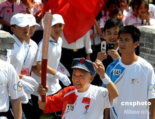 5月14日,95岁高龄的刘家奇老人在中华苏维埃共和国中央政府旧址的“红井”传递奥运圣火。 中新社发 廖攀 摄