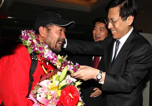 火炬登山传递队队长、火炬手王勇峰在机场受到英雄般的欢迎。