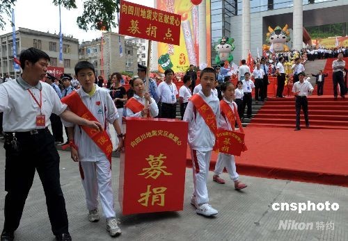 5月15日,奥运圣火在江西井冈山传递,中学生在圣火所经过的路线上布置募捐箱向四川灾区募集善款,沿途民众纷纷响应奉献爱心。当日,奥运圣火传递提出“传递圣火奉献爱心”的口号。 中新社发 廖攀 摄