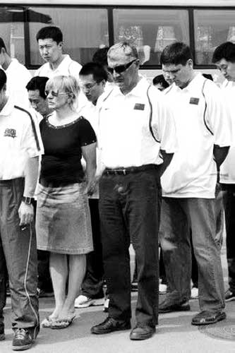 2008年5月19日下午14点28分,北京。中国男篮和其他备战北京奥运会的体育健儿一起,在国家体育总局训练局西院,在警报声和汽车鸣笛声中,为“5.12”汶川大地震中的遇难者默哀3分钟,以表达他们对遇难者的哀思。