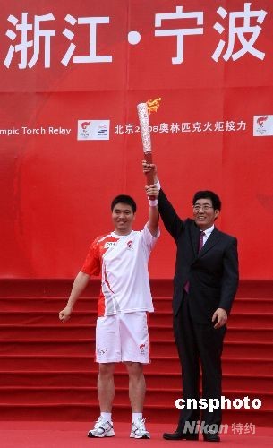 5月22日,举国哀悼四川汶川大地震遇难同胞三天后,北京奥运圣火在宁波继续传递。图为第一棒火炬手竺士杰从宁波市委书记巴音朝鲁手中接过火炬。 中新社发 周兆军 摄
