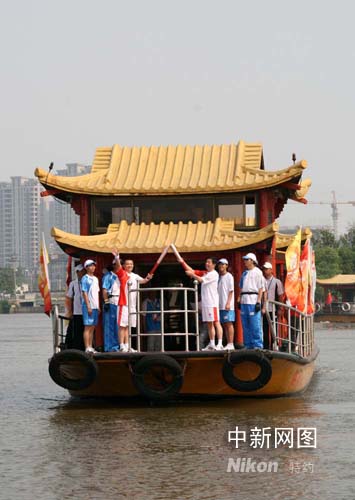 5月22日,奥运圣火来到浙江嘉兴。图为奥运圣火在南湖水上传递。