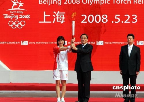 5月23日,北京奥运圣火在上海开始传递。奥运火炬将在上海传递2天,共有416名火炬手参加上海段的火炬传递活动,奥运游泳冠军庄泳担任首棒。图为庄泳从中共中央政治局委员,中共上海市委书记俞正声手中接过奥运火炬。 中新社发 汤彦俊 摄
