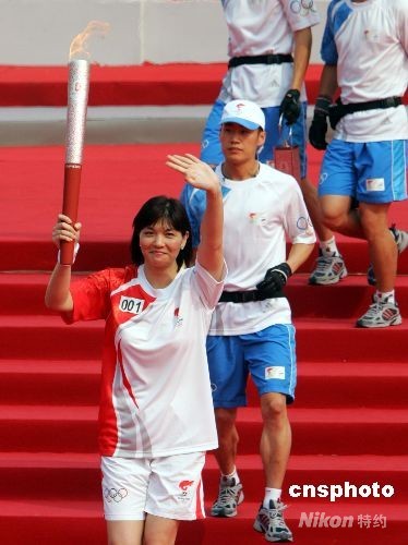 图:奥运冠军庄泳跑出圣火上海传递首棒