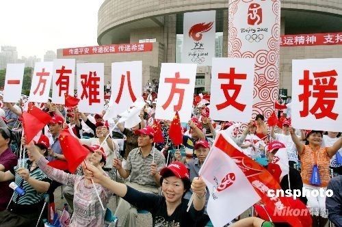 5月23日,北京奥运圣火在上海开始传递。上海市民在喜迎奥运圣火的同时,更心系着四川地震灾区人民,在火炬传递沿途高举“一方有难,八方支援”、“团结一致,众志成城”等横幅,表达和四川地震灾区民众共度难关的决心。 中新社发 汤彦俊 摄
