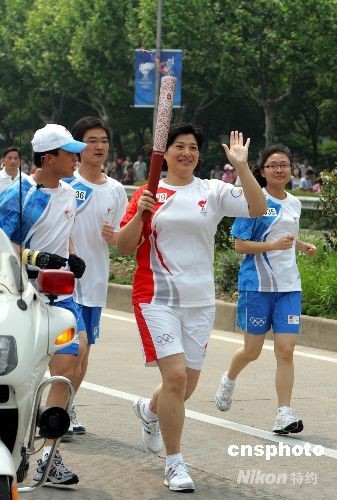 5月23日,北京奥运圣火在上海开始为期2天的传递,共有416名火炬手参加。图为女排名宿李国君在沪传递奥运圣火。 中新社发 汤彦俊 摄