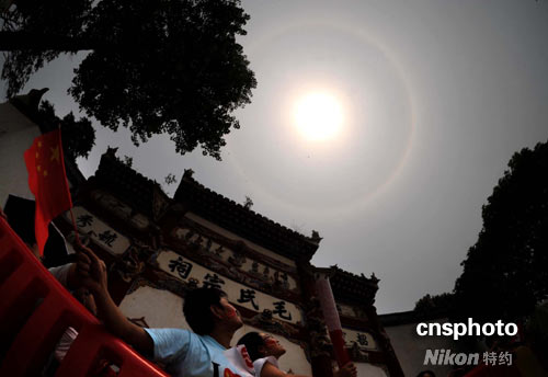 6月5日,奥运圣火湖南传递在韶山结束后,天空出现日晕奇观,毛氏宗祠前为圣火欢呼的人们仰望奇观。中新社发 廖攀 摄