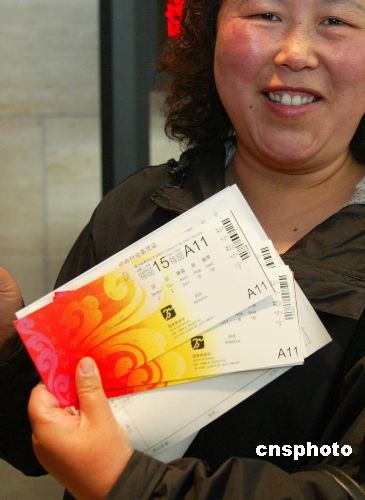 资料图片:5月5日,北京奥运会第三阶段门票销售正式启动。由于这一阶段采取“先到先得”的售票原则,公众购票热情十分高涨。据奥运票务中心统计,截至当日上午11时40分,男足半决赛和决赛、男子110米栏半决赛、男篮预赛等8个场次的门票已售罄。第三阶段销售将投放奥运门票138万张,涵盖16个大项的244个比赛场次。图为一位民众买到票后异常高兴。 中新社发 富田 摄