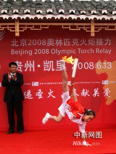 6月13日,奥运火炬在贵州黔东南传递,第一棒火炬手、体操运动员林丽接过火炬后,做起了精彩的体操动作,引得现场一阵欢呼。