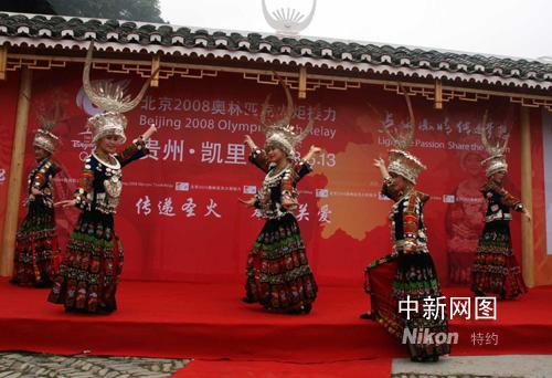 6月13日,奥运火炬在贵州黔东南传递,郎德苗寨的姑娘们载歌载舞迎接奥运火炬。记者周兆军摄