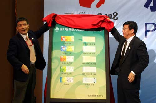 在今天下午的北京残奥会体育比赛门票销售新闻发布会,北京奥运票务中心主任朱炎、副主任于喜来共同揭晓北京残奥会门票票样。