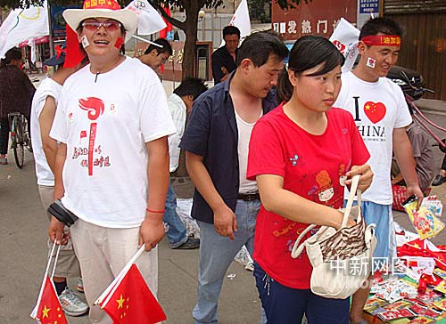 记者上午在运城的街头看到,各家商户门面都悬挂奥运彩旗,出租车、三轮车、摩托车等都自发的在车头车尾插上彩旗。印有各色奥运标志图案的文化衫火了运城的一条街。