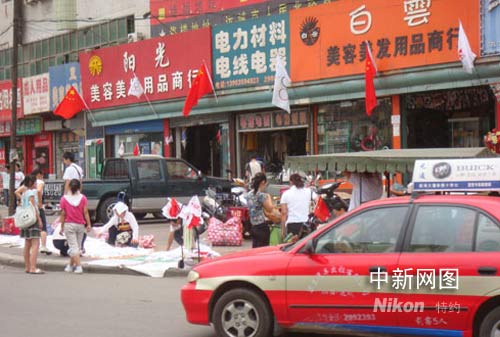 运城街头各家商户门面都悬挂奥运彩旗。作者 长年