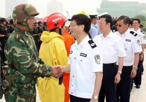 北京奥运安保工作协调小组组长、公安部党委副书记、副部长刘京,国务院副秘书长汪永清,国家反恐办主任、公安部党委委员、副部长孟宏伟和天津市委副书记、市长黄兴国等领导一同观看了演习。(徐灿)