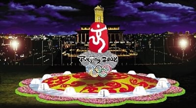 中心花坛的主题为“舞动的北京”,以奥运会会徽为主景,以“祥云”图案为衬托。