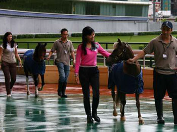 中新网7月11日电 据香港大公报报道,为庆祝香港协办北京奥运马术及残奥马术比赛,美国雪特兰小马策骑协会特赠送两匹雪特兰小马予香港马术总会,10日联同香港赛马会在跑马地马场亮相圈举行交接仪式。