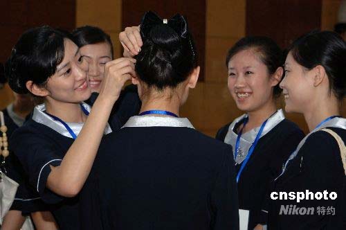 参加北京奥运会颁奖仪式的专业志愿者正在互相整理发型。中新社发 王东明 摄