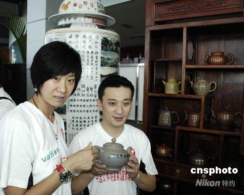 7月12日,“2008奥林匹克文化中国行”在海南三亚开幕。作为全国巡展的首站,三亚的展览活动历时两天,公开展示由226名书画家共同创作的奥运主题大型书画作品《神州圣火传递图》和《神州圣火传递颂》。作品全面描绘了113个火炬传递城市的风土人情。活动期间还展出奥运文化优秀作品“中华紫砂壶”和“盛世将军瓶”。图为1996年亚特兰大奥运会游泳冠军乐静宜(左)和2000年悉尼奥运会跳水冠军肖海亮(右),在“中华紫砂壶”和“盛世将军瓶”前展示“中华紫砂壶”。中新社发 尹海明 摄