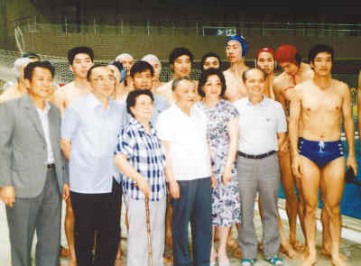 1990年7月3日,邓小平视察北京亚运村后,在游泳馆看望中国水球队运动员。