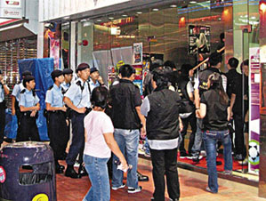 香港警方12日晚展开“雷霆08”反罪恶行动,拘120人。图为探员于元朗教育路的一间卡拉OK巡查。(图片来源:文汇报)