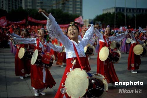 图:长春姑娘舞起长鼓迎接奥运圣火